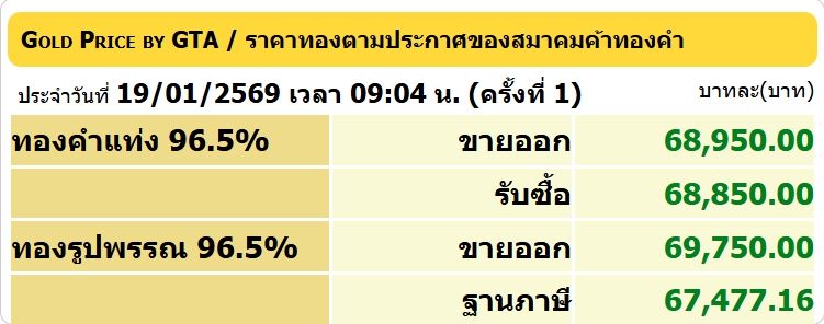 - ทองคำแท่ง 96.5% รับซื้อ บาททองคำละ 68,850 บาท ขายออกบาททองคำละ 68,950 บาท
