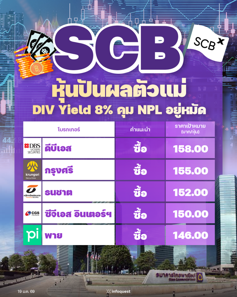 สำหรับ NPL ในปี 69 คาดว่าอาจทรงตัวหรือลดลงจากปี 68 ที่ 3.5% ทำให้การตั้งสำรองอาจจะใกล้เคียงหรือลดลงจากปีก่อน ช่วยหนุนและประคองกำไร แต่คาดว่ากำไรในปีนี้อาจปรับตัวลงมาบ้างตามทิศทางดอกเบี้ย แต่มองว่า SCB เป็นหุ้นที่ยังให้ผลตอบแทนที่ดีสำหรับนักลงทุนที่มองหาการลงทุนในหุ้นปันผล แต่ควรหาจังหวะทยอยเข้าซื้อหลังจากราคาขึ้นมาในระดับหนึ่งแล้ว โดยให้ราคาเป้าหมายที่ 155 บาท/หุ้น คงคำแนะนำ “ซื้อ”