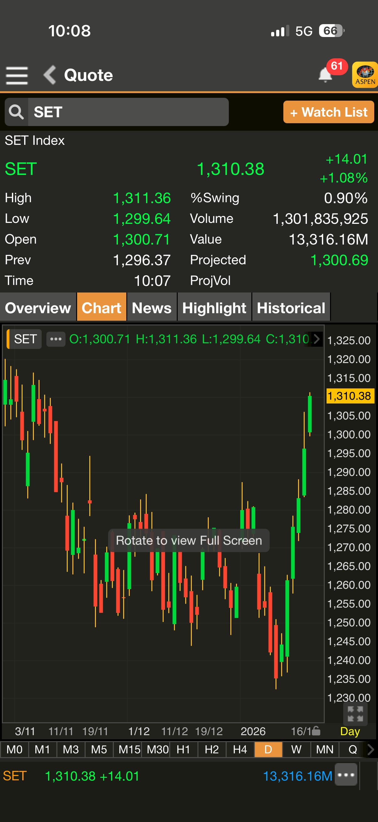 เมื่อเวลา 10.07 น. ดัชนี SET มาอยู่ที่ 1,310.38 จุด เพิ่มขึ้น 14.01 จุด (+1.08%)