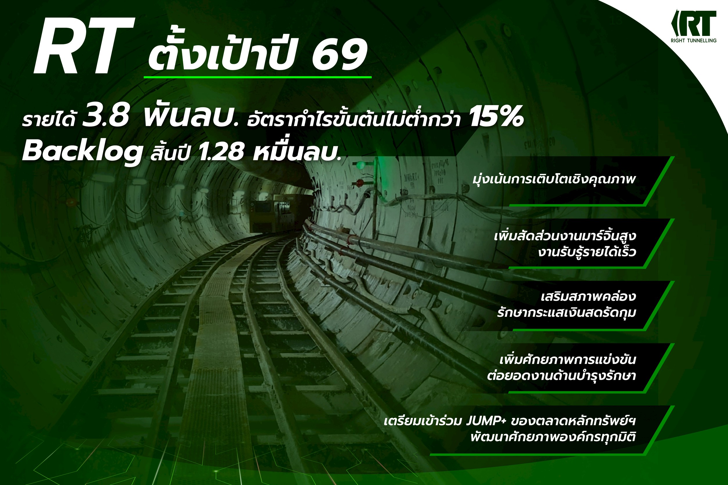 นายชวลิต ถนอมถิ่น ประธานเจ้าหน้าที่บริหาร บมจ.ไร้ท์ทันเน็ลลิ่ง [RT] เปิดเผยว่า ในปี 69 บริษัทตั้งเป้าหมายรายได้รวมประมาณ 3,900 ล้านบาท พร้อมรักษาอัตรากำไรขั้นต้นไม่ต่ำกว่า 15% และตั้งเป้าผลักดันงานในมือ (Backlog) ให้แตะระดับ 12,000 ล้านบาทสิ้นปีนี้ ตอกย้ำความเป็นผู้นำในธุรกิจวิศวกรรมโยธาและธรณีเทคนิคอย่างครบวงจร