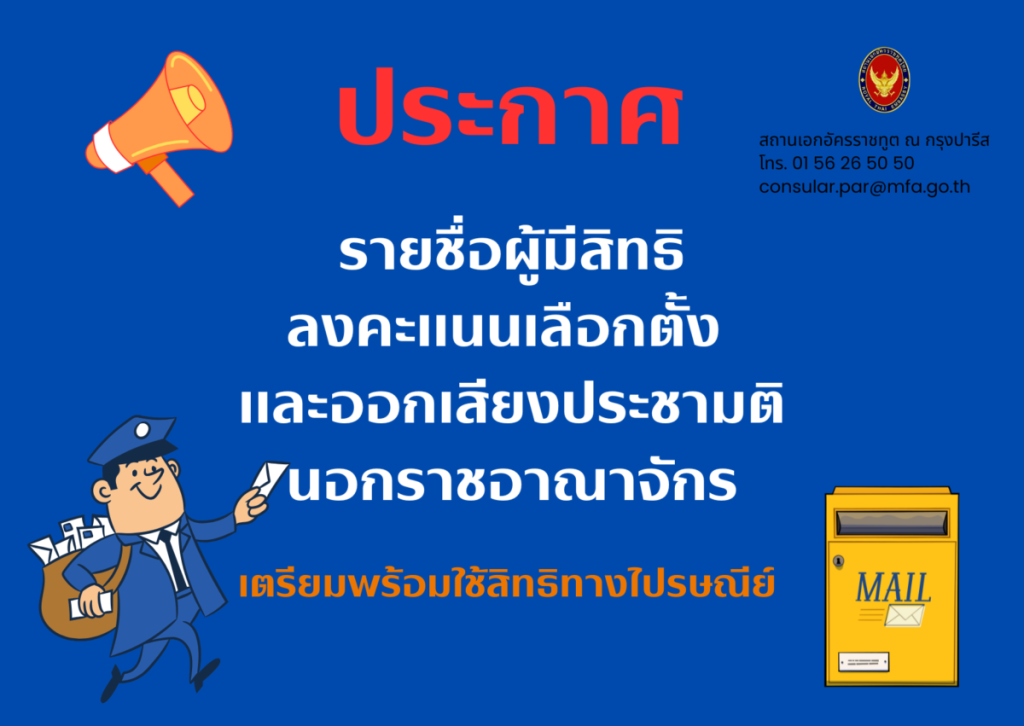 สำหรับท่านที่พำนักอยู่ในปารีสหรือเขตใกล้เคียงสามารถมายื่นเอกสารเลือกตั้งคืนที่ สอท.ไทยฯ ได้ด้วยตนเองเช่นกัน ตามที่อยู่ 8 rue de Greuze 75016 Paris (ทั้งในและนอกเวลานอกราชการ รวมถึงวันเสาร์-อาทิตย์) หากมีข้อสงสัยหรือประสงค์สอบถามเพิ่มเติม ท่านสามารถติดต่อได้ที่ [email protected] หรือ 01 56 26 50 50 ext 126