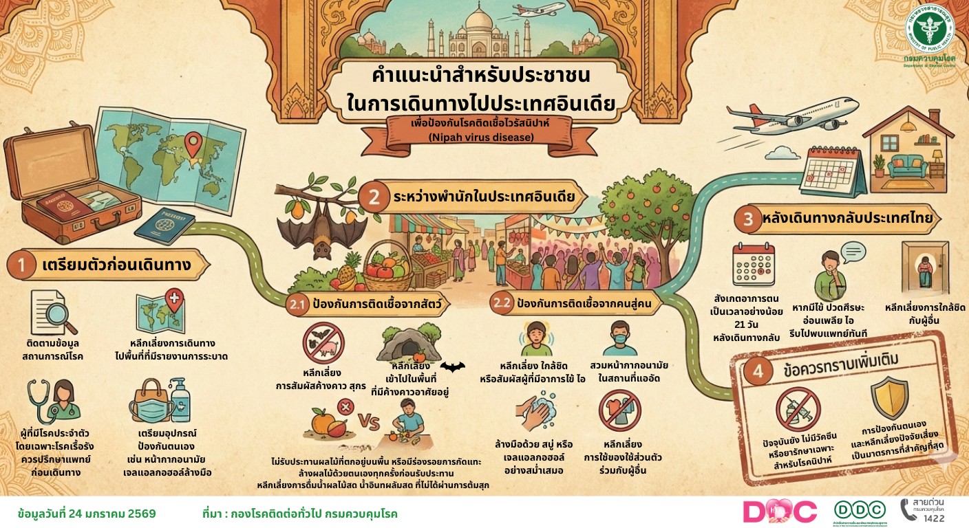 นพ.มณเฑียร คณาสวัสดิ์ อธิบดีกรมควบคุมโรค กระทรวงสาธารณสุข (สธ.) เผยติดตามสถานการณ์โรคติดเชื้อไวรัสนิปาห์ (Nipah Virus Disease) ในประเทศอินเดียอย่างต่อเนื่อง หลังพบการระบาดเป็นระยะในบางรัฐของอินเดีย ขณะที่ประเทศไทยยังไม่พบรายงานผู้ป่วย โดยกระทรวงฯ ได้เตรียมความพร้อมด้านการเฝ้าระวัง ป้องกัน และควบคุมโรคอย่างเป็นระบบ เพื่อดูแลความปลอดภัยด้านสุขภาพของประชาชน โดยเฉพาะผู้ที่มีแผนเดินทางไปและกลับจากประเทศอินเดีย