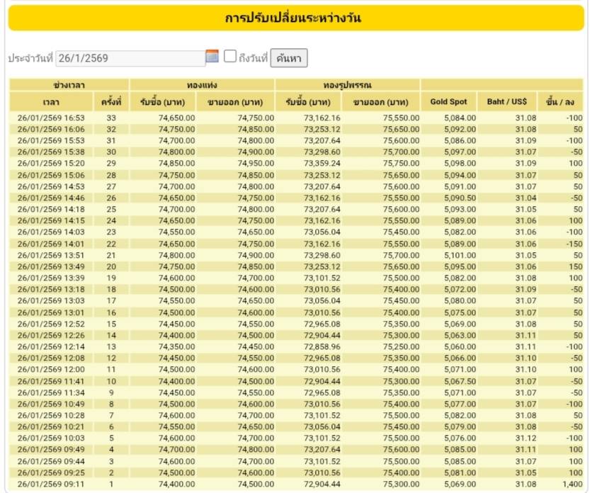 - ทองรูปพรรณ 96.5% รับซื้อ บาททองคำละ 73,359.24 บาท ขายออก บาททองคำละ 75,750 บาท