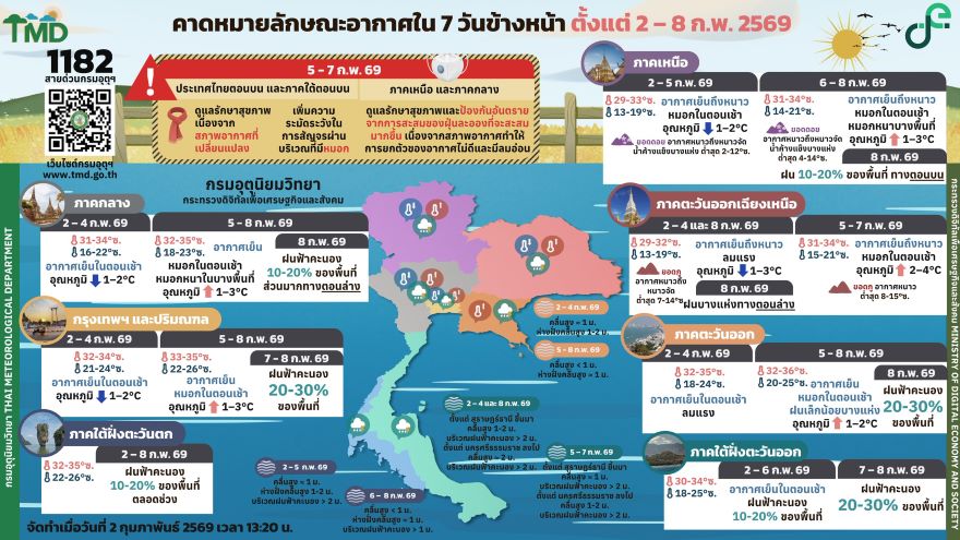 – ภาคตะวันออกเฉียงเหนือ : วันที่ 8-9 ก.พ. 69 อากาศเย็นถึงหนาว อุณหภูมิจะลดลง 2-4 องศาเซลเซียส กับมีลมแรง โดยมีฝนบางแห่งทางตอนล่าง