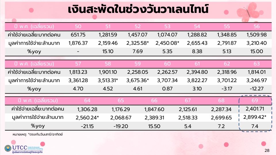 ศูนย์พยากรณ์เศรษฐกิจและธุรกิจ มหาวิทยาลัยหอการค้าไทย เปิดเผยผลสำรวจ “พฤติกรรมการใช้จ่ายของประชาชน ในวันวาเลนไทน์ 69” จากกลุ่มตัวอย่างในช่วงวันที่ 26-31 ม.ค. 69 พบว่า ในช่วงวาเลนไทน์ ปี 69 คาดว่าจะมีเม็ดเงินสะพัด 2,899 ล้านบาท เพิ่มขึ้น 7.4% จากปีก่อน โดยถือว่าสูงสุดในรอบ 6 ปี (ตั้งแต่ปี 64)