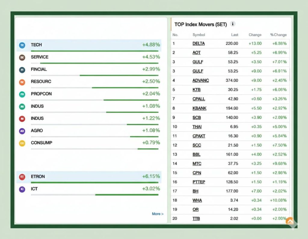 โดยมีทั้งหุ้นเทคโนโลยี พลังงาน ธนาคาร ค้าปลีก และโลจิสติกส์ร่วมขับเคลื่อน ซึ่งเป็นลักษณะของวันที่เงินก้อนใหญ่เข้าตลาด ไม่ใช่การรีบาวด์เฉพาะกลุ่ม และตอกย้ำว่าแรงซื้อกระจายตัวในหุ้นแกนหลักของตลาดอย่างแท้จริง