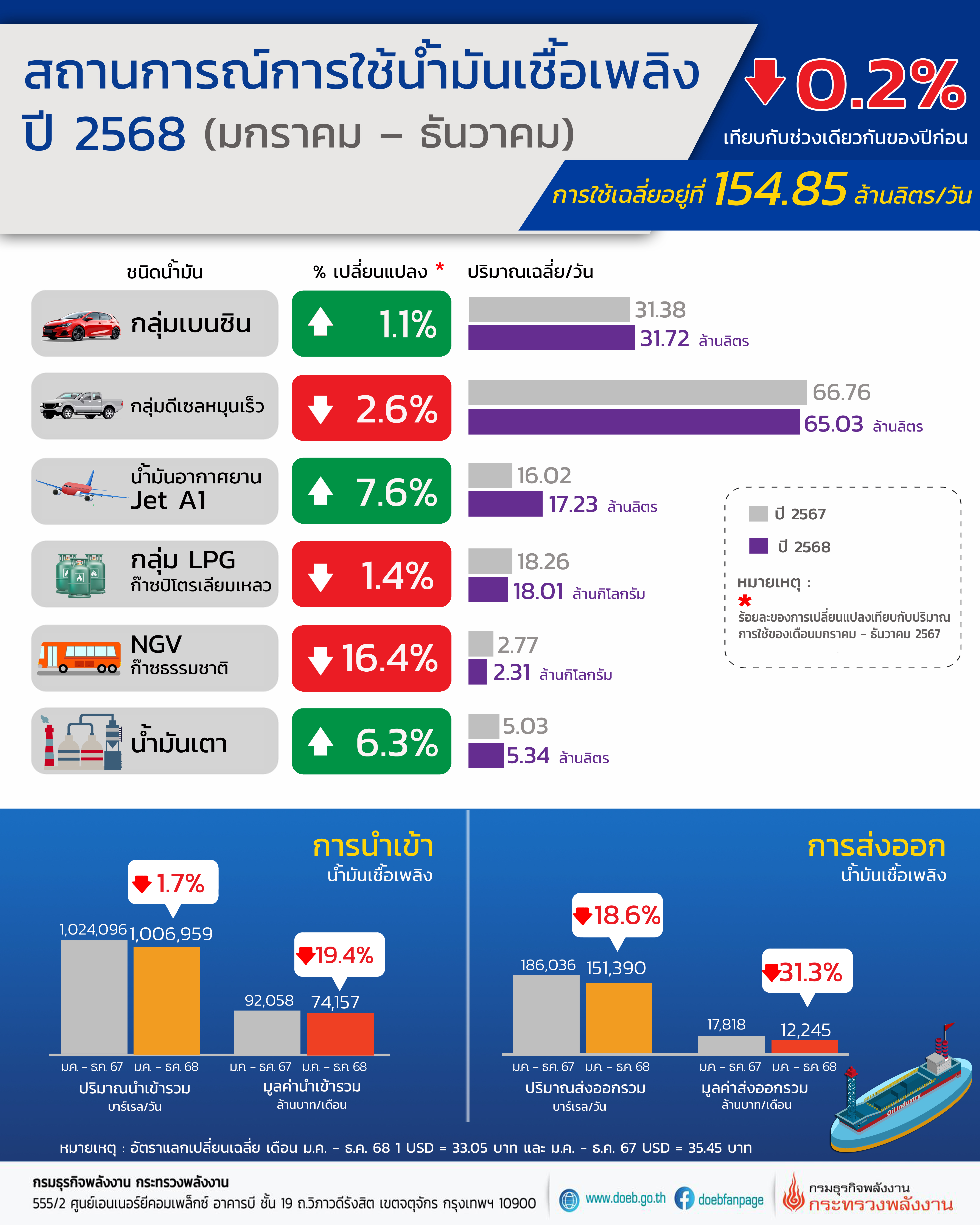นายสราวุธ แก้วตาทิพย์ อธิบดีกรมธุรกิจพลังงาน เผยภาพรวมการใช้น้ำมันเชื้อเพลิงปี 68 (ม.ค.-ธ.ค.) มีปริมาณการใช้อยู่ที่ 154.85 ล้านลิตร/วัน ลดลง 0.2% เมื่อเทียบกับช่วงเดียวกันของปีก่อน โดยก๊าซธรรมชาติสำหรับยานยนต์ (NGV) มีปริมาณการใช้ลดลงสูงสุดที่ 16.4% ตามด้วยน้ำมันดีเซลหมุนเร็วลดลง 2.6% และก๊าซปิโตรเลียมเหลว (LPG) ลดลง 1.4% ขณะที่น้ำมันอากาศยานเชิงพาณิชย์ (Jet A1) มีปริมาณการใช้เพิ่มขึ้น 7.6% การใช้น้ำมันเตาเพิ่มขึ้น 6.3% และกลุ่มเบนซินเพิ่มขึ้น 1.1%