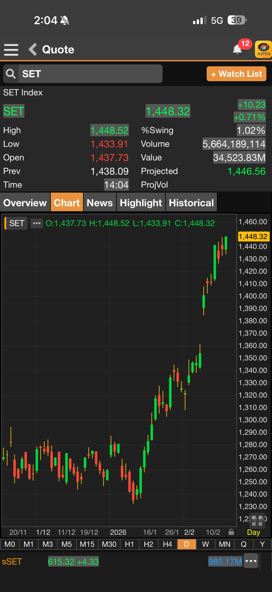• เมื่อเวลา 14.04 น. ดัชนี SET อยู่ที่ 1,448.32 จุด เพิ่มขึ้น 10.23 จุด (+0.71%)