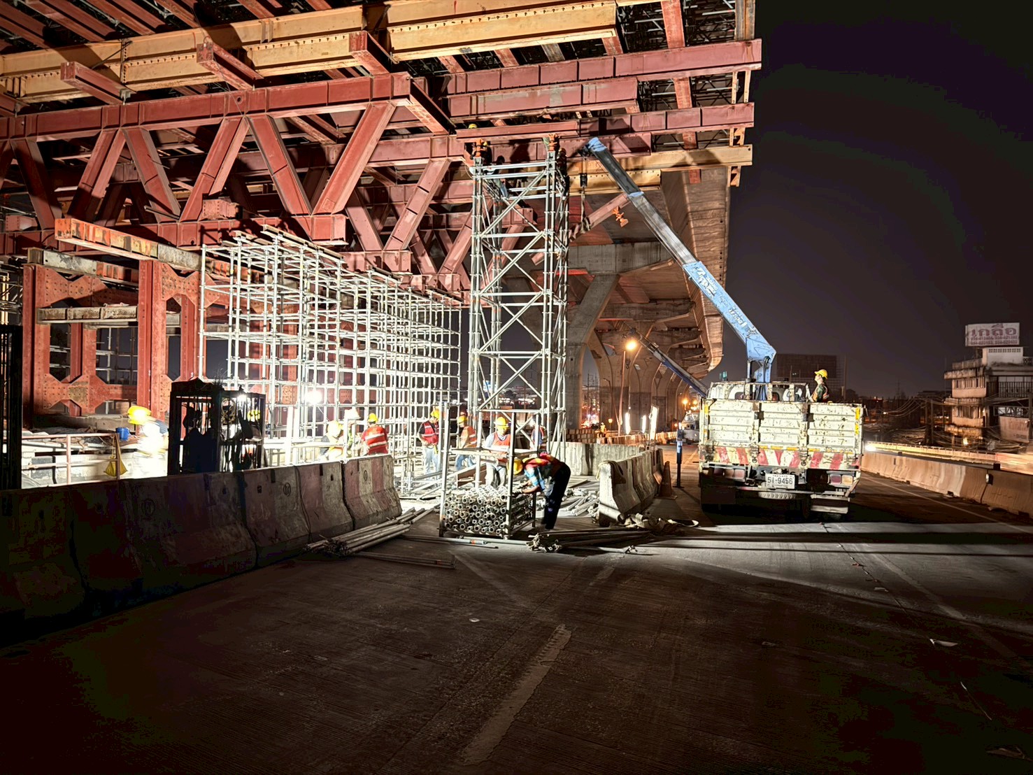 2. งานรื้อถอนโครงสร้างคานคอนกรีตอัดแรงที่เสียหายจากเหตุเครน LG ถล่ม : ปัจจุบันได้เคลื่อนย้าย LG มาติดตั้งบริเวณช่วง Span ที่จะรื้อถอนโครงสร้างคานที่เสียหายชุดแรก พร้อมติดตั้งอุปกรณ์ชุดแขวนชิ้นส่วนคานรูปกล่องแต่ละก้อน รวมถึงติดตั้งระบบตรวจวัดพฤติกรรมโครงสร้างในระหว่างปฏิบัติงานแบบ Real-time (Structural Health Monitoring) แล้วเสร็จเรียบร้อย โดยจะเริ่มขั้นตอนการปลดแรงในลวดอัดแรง (Tendon) และถ่ายน้ำหนัก (Load Transfer) ของ Segment ไปยังชุดแขวนฯ ในคืนวันที่ 19-20 ก.พ.69