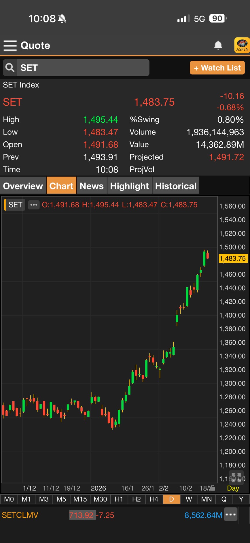 - เมื่อเวลา 10.08 น. ดัชนี SET มาอยู่ที่ 1,483.75 จุด ลดลง 10.16 จุด (-0.68%)
