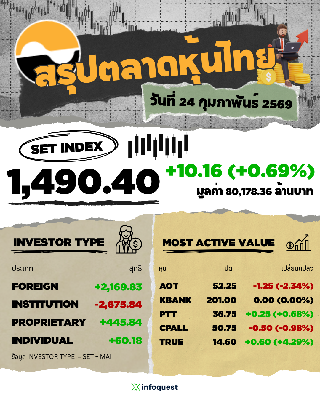 - SET ปิดวันนี้ที่ 1,490.40 จุด เพิ่มขึ้น 10.16 จุด (+0.69%) มูลค่าซื้อขาย 80,178.36 ล้านบาท