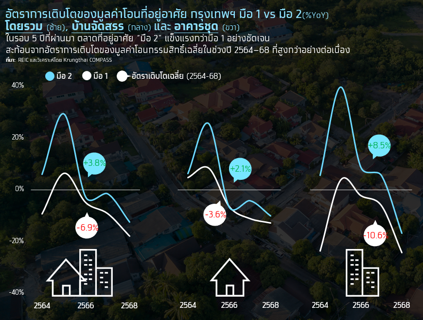 โดยในปี 2564-2568 มูลค่าโอนกรรมสิทธิ์บ้านมือ 2 เติบโตได้เฉลี่ย 3.8% ต่อปี ขณะที่มือ 1 หดตัวเฉลี่ย -6.9% ต่อปี รูปแบบดังกล่าวเกิดขึ้นทั้งในตลาดบ้านจัดสรร และตลาดคอนโดมิเนียม จึงอาจกล่าวได้ว่าตลาดที่อยู่อาศัยมือ 2 ถือเป็น Segment ที่ช่วยประคับประคองตลาดที่อยู่อาศัยในช่วงเวลานี้