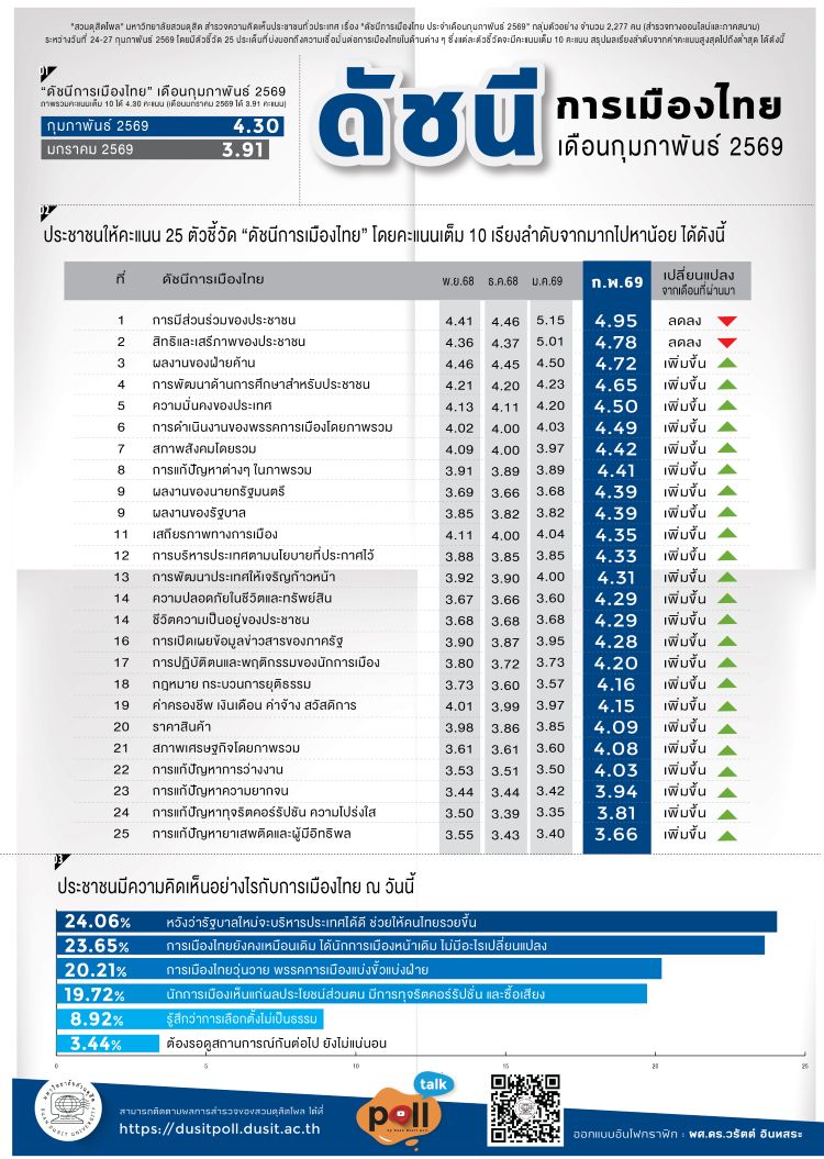 สวนดุสิตโพล มหาวิทยาลัยสวนดุสิต สำรวจความคิดเห็นประชาชนทั่วประเทศ เรื่อง “ดัชนีการเมืองไทย ประจำเดือน กุมภาพันธ์ 2569” ซึ่งเป็นการสำรวจจากกลุ่มตัวอย่าง 2,277 คน (ทางออนไลน์ และภาคสนาม) ระหว่างวันที่ 24-27 ก.พ.69