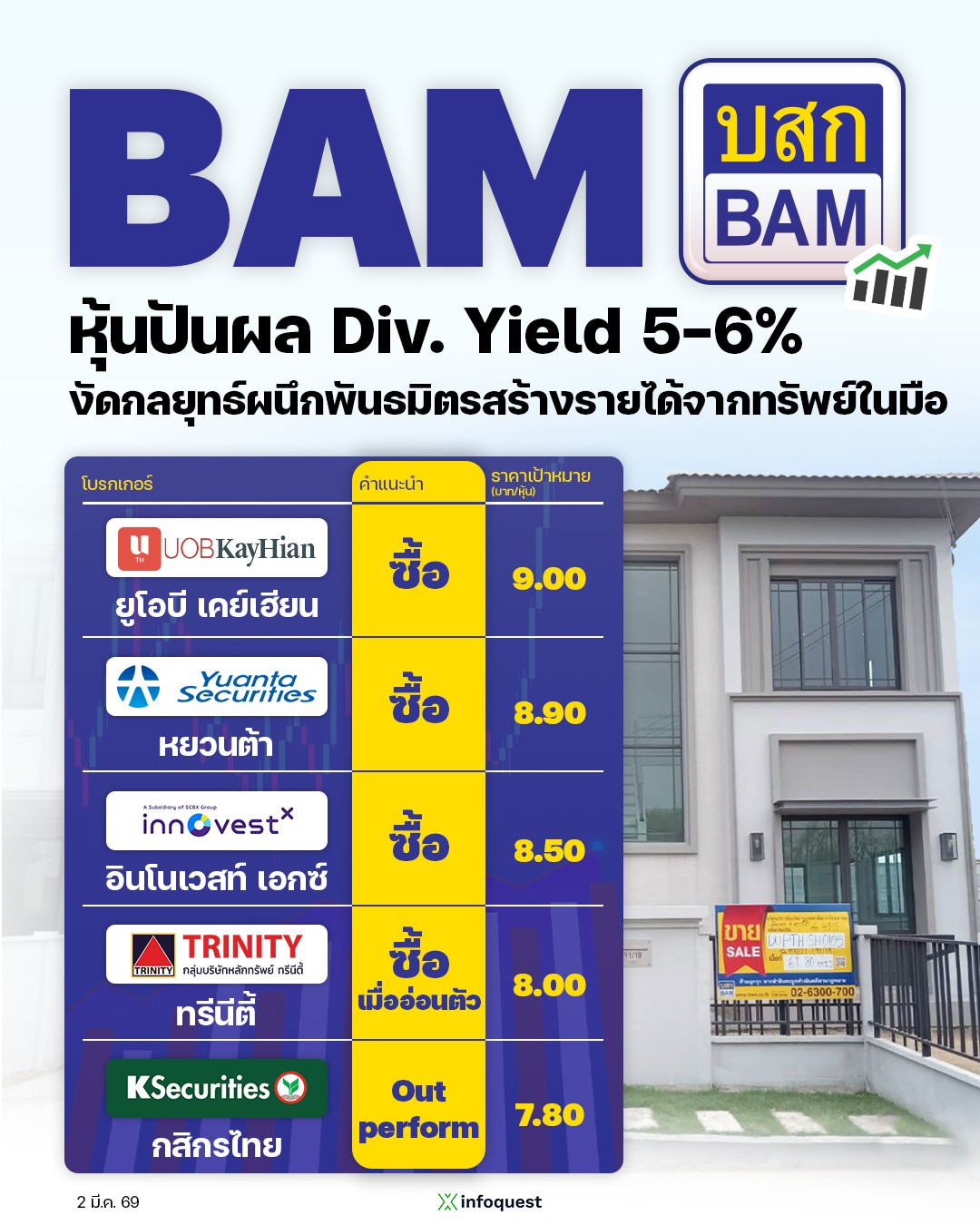 ด้านภาพรวมธุรกิจของ BAM ในปี 69 ยังมีปัจจัยหนุนจากทิศทางดอกเบี้ยที่ปรับตัวลง ซึ่งส่งผลหนุนต่อการที่จะมีโอกาสที่ขายทรัพย์ NPA ได้จากแนวโน้มที่สถาบันการเงินจะมีการปล่อยสินเชื่อได้สูงขึ้น อีกทั้งยังมีปัจจัยหนุนจากบริษัทร่วมทุนที่เข้ามาหนุนในส่วนของกำไร นอกจากนี้ BAM ยังเป็นอีกหนึ่งหุ้นในธีมปันผลที่คาดหวังผลตอบแทนจากเงินปันผลราว 5.5% ต่อปี แต่อัพไซด์ของราคาอาจจะจำกัด แต่ยังให้คำแนะนำ “ซื้อเก็งกำไร” ราคาเป้าหมาย 8 บาท/หุ้น