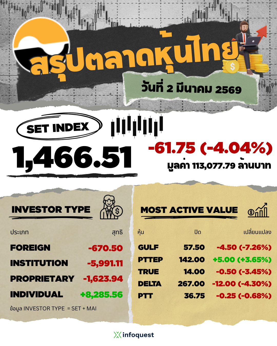 • SET ปิดวันนี้ที่ 1,466.51 จุด ลดลง 61.75 จุด (-4.04%) มูลค่าซื้อขาย 113,077.79 ล้านบาท
