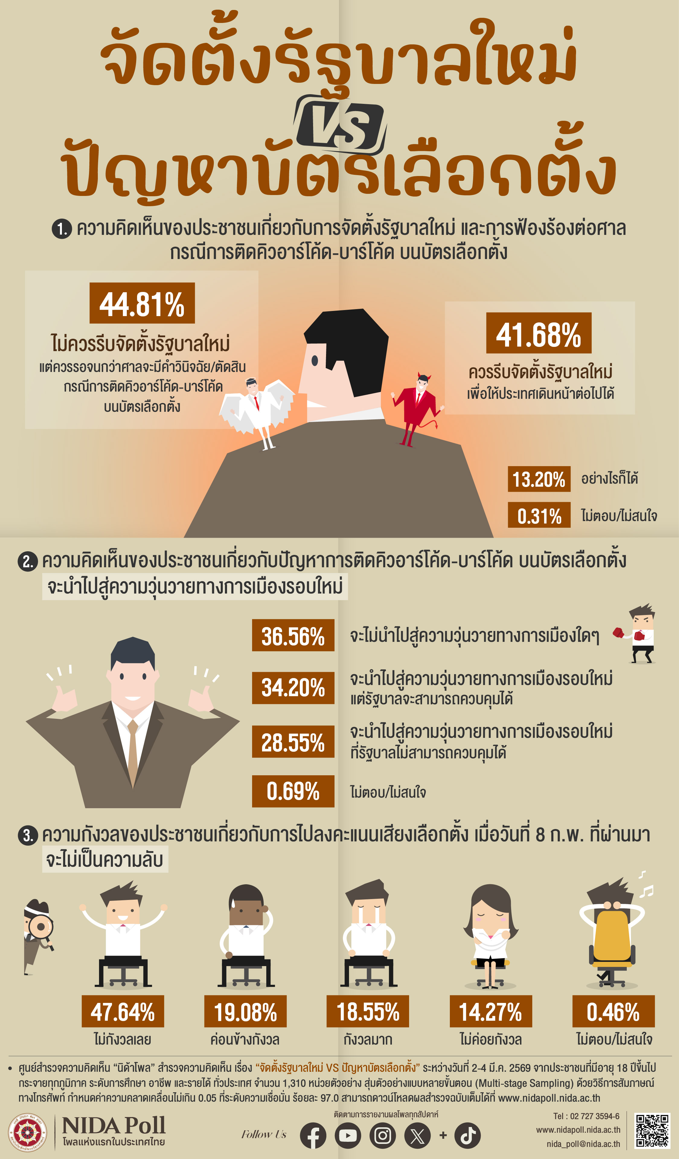 ศูนย์สำรวจความคิดเห็น “นิด้าโพล” สถาบันบัณฑิตพัฒนบริหารศาสตร์ (นิด้า) เปิดเผยผลการสำรวจเรื่อง “จัดตั้งรัฐบาลใหม่ VS ปัญหาบัตรเลือกตั้ง” ทำการสำรวจระหว่างวันที่ 2-4 มีนาคม 2569 จากการสำรวจเมื่อถามความคิดเห็นของประชาชนเกี่ยวกับการจัดตั้งรัฐบาลใหม่ และการฟ้องร้องต่อศาล กรณีการติดคิวอาร์โค้ด-บาร์โค้ด บนบัตรเลือกตั้ง พบว่า ตัวอย่าง 44.81% ระบุว่า ไม่ควรรีบจัดตั้งรัฐบาลใหม่ แต่ควรรอจนกว่าศาลจะมีคำวินิจฉัย/ตัดสิน กรณีการติดคิวอาร์โค้ด-บาร์โค้ด บนบัตรเลือกตั้ง รองลงมา 41.68% ระบุว่า ควรรีบจัดตั้งรัฐบาลใหม่ เพื่อให้ประเทศเดินหน้าต่อไปได้ 13.20% ระบุว่า อย่างไรก็ได้และ 0.31% ระบุว่า ไม่ตอบ/ไม่สนใจ