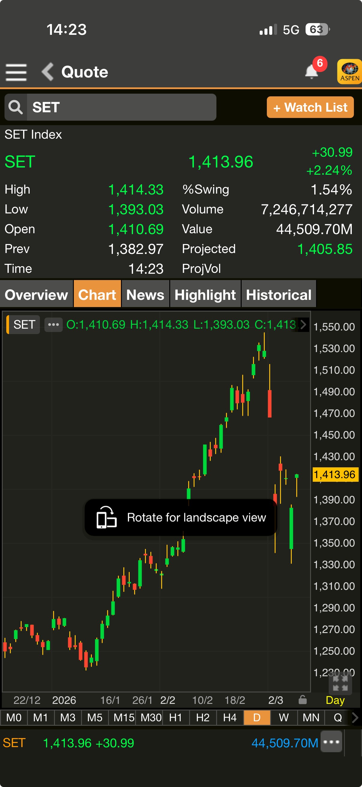 - เมื่อเวลา 14.23 น. ดัชนี SET มาอยู่ที่ 1,413.96 จุด เพิ่มขึ้น 30.96 จุด (+2.24%)