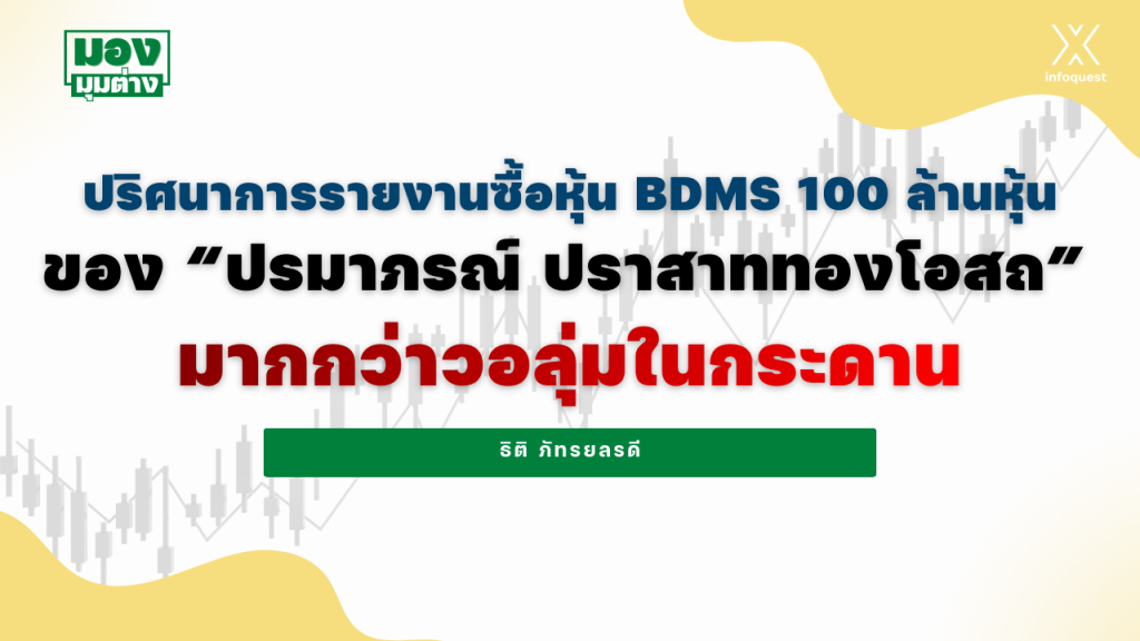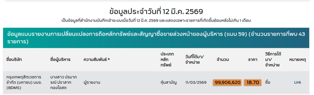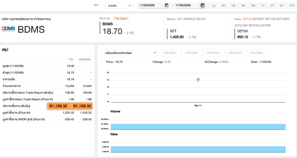 แต่เมื่อนำตัวเลขดังกล่าวไปเปรียบเทียบกับข้อมูลการซื้อขายจริงในตลาดหลักทรัพย์แห่งประเทศไทย กลับพบข้อสังเกตที่น่าสนใจ นั่นคือ ในวันที่ 11 มีนาคม 2569 หุ้น BDMS มีปริมาณการซื้อขายรวมทั้งวันเพียง 81,159,315 หุ้นเท่านั้น ซึ่งน้อยกว่าจำนวนหุ้นที่รายงานว่าได้มาถึงเกือบ 19 ล้านหุ้น
