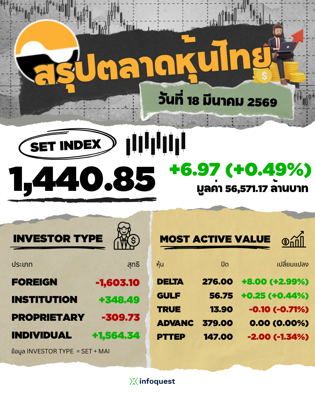 SET ปิดวันนี้ที่ 1,440.85 จุด เพิ่มขึ้น 6.97 จุด (+0.49%) มูลค่าซื้อขาย 56,571.17 ล้านบาท