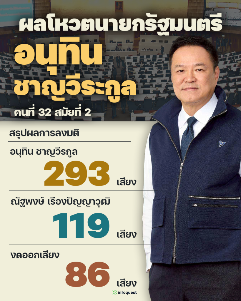 สภาผู้แทนราษฎร มีมติเห็นชอบให้ “นายอนุทิน ชาญวีรกูล” หัวหน้าพรรคภูมิใจไทย เป็นนายกรัฐมนตรี สมัยที่ 2 ด้วยคะแนน 293 เสียง ส่วนเสียงสนับสนุน “นายณัฐพงษ์ เรืองปัญญาวุฒิ” จากพรรคประชาชน มี 119 เสียง และงดออกเสียง 86 เสียง