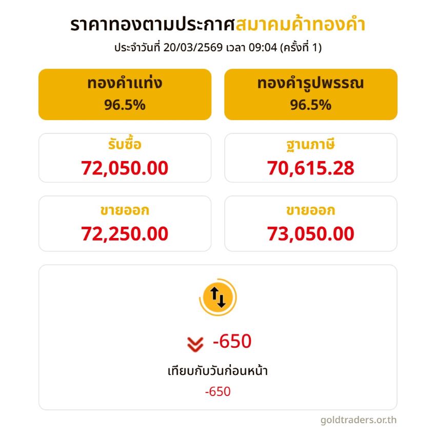 – ทองคำแท่ง รับซื้อ บาททองคำละ 72,050 บาท ขายออก บาททองคำละ 72,250 บาท