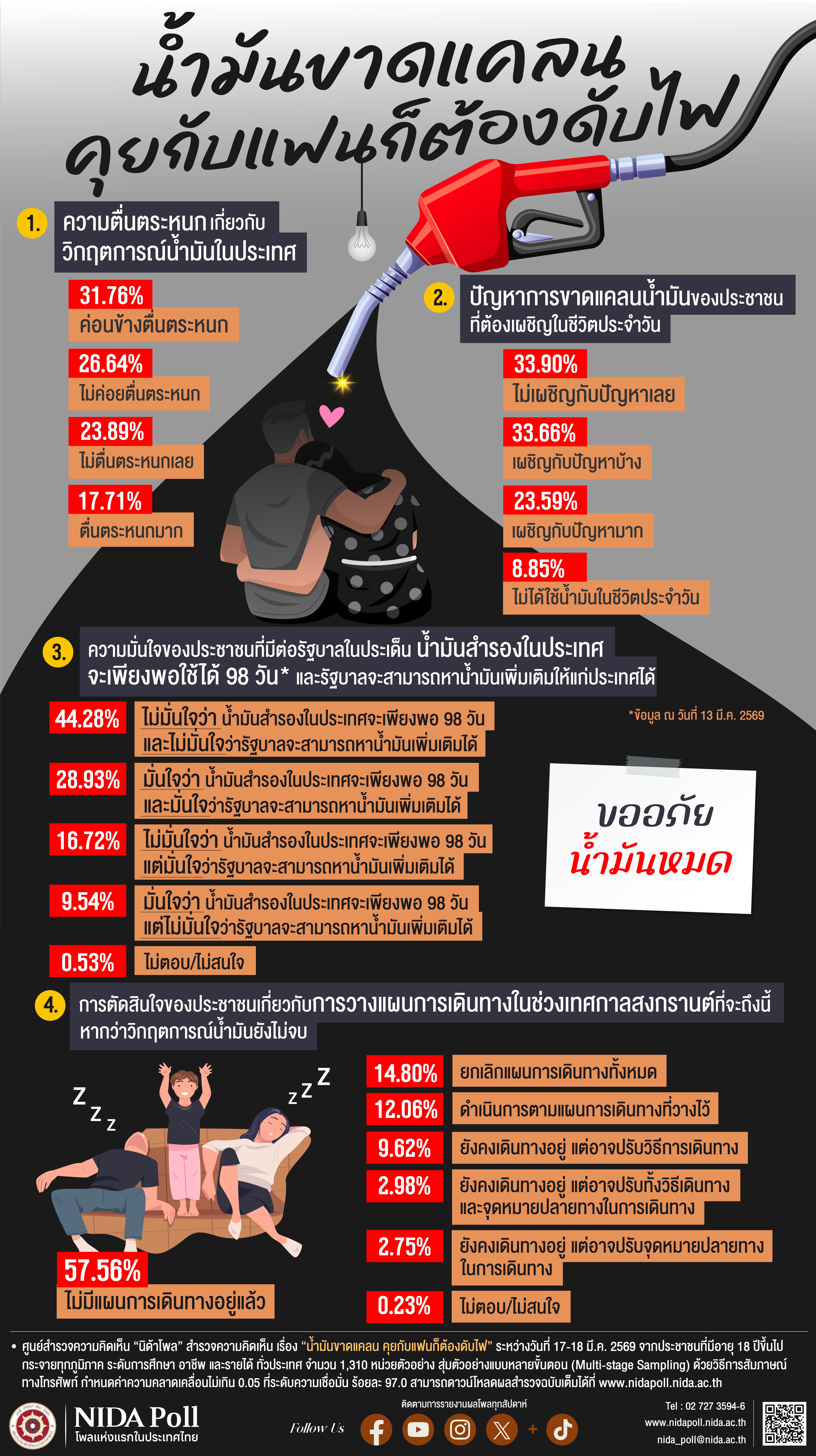ศูนย์สำรวจความคิดเห็น “นิด้าโพล” สถาบันบัณฑิตพัฒนบริหารศาสตร์ (นิด้า) เปิดเผยผลการสำรวจเรื่อง “น้ำมันขาดแคลน คุยกับแฟนก็ต้องดับไฟ” โดยทำการสำรวจระหว่างวันที่ 17-18 มีนาคม 2569 จากประชาชนที่มีอายุ 18 ปีขึ้นไป กระจายทุกภูมิภาค ระดับการศึกษา อาชีพ และรายได้ ทั่วประเทศ รวมจำนวนทั้งสิ้น 1,310 หน่วยตัวอย่าง