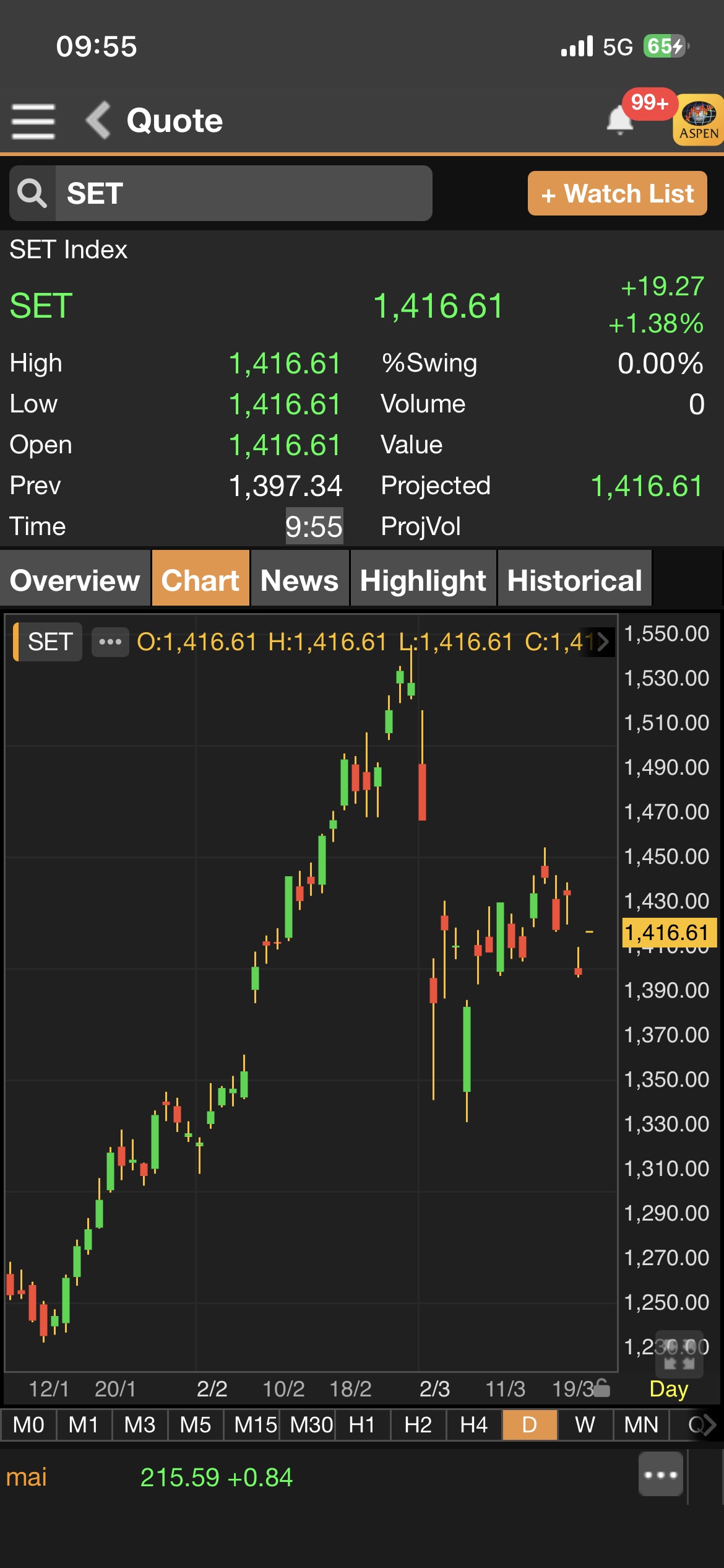 - เมื่อเวลา 9.55 น. ดัชนี SET มาอยู่ที่ 1,416.61 จุด เพิ่มขึ้น 19.27 จุด (+1.38%)