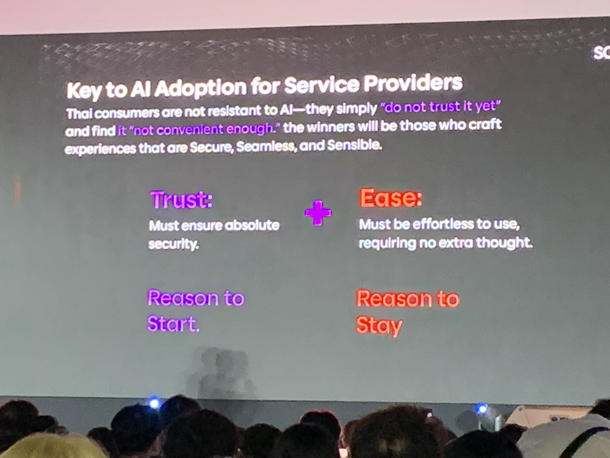 คุณสุธีรพันธุ์ได้สรุปทิ้งท้ายเกี่ยวกับการที่ผู้ให้บริการจะนำ AI มาประยุกต์ใช้ว่า คนไทยไม่ได้ต่อต้าน AI เพียงแต่ยังไม่เชื่อมั่นและยังไม่เห็นว่าสะดวกพอที่จะใช้งานเท่านั้น ดังนั้น ผู้ที่สามารถสร้างประสบการณ์ที่ปลอดภัย ราบรื่นไร้รอยต่อ และรวดเร็ว จึงจะเป็นผู้ชนะ เพราะ “ความเชื่อมั่น” คือเหตุผลที่ผู้คนจะเริ่มต้นใช้ AI และ “ความสะดวกสบาย” คือเหตุผลที่คนจะใช้งานต่อ