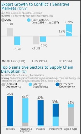1. การส่งออกเติบโตชะลอลงจากอุปสรรคด้านโลจิสติกส์ ซึ่งเหตุการณ์ปัจจุบันสามารถเทียบเคียงกับช่วงกบฎฮูตีโจมตีเรือขนส่งสินค้าในทะเลแดง ที่มีผลต่อการส่งออกสินค้าไทยไปตะวันออกกลาง ต้นทุนการขนส่งสินค้าที่เพิ่มขึ้น และการขนส่งสินค้าไปยังยุโรปที่ล่าช้า จากการอ้อมไปทางแหลมกู๊ดโฮปส์ โดยช่วงที่สถานการณ์ยกระดับรุนแรง (พ.ย. 66-ก.พ. 67) การส่งออกไปยุโรปและตะวันออกกลางหดตัว -2.1%YoY และ -3.3%YoY ขณะที่ส่งออกไปสหรัฐฯ ยังเติบโตโดดเด่นที่ 11.5%YoY เนื่องจากภาวะขาขึ้นของวัฏจักรอิเล็กทรอนิกส์โลก ผลกระทบต่อการส่งออกอาจกลับมารุนแรงอีกครั้งหากเหตุการณ์ความขัดแย้งในปัจจุบันยืดเยื้อ