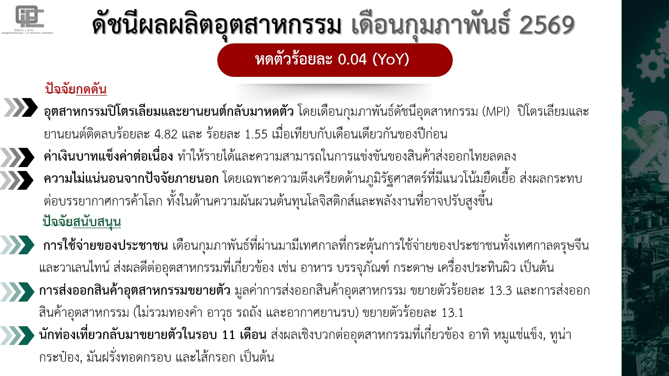 โดยภาพรวมภาคอุตสาหกรรมไทยในเดือนก.พ. 69 ยังมีแรงหนุนจากการใช้จ่ายช่วงเทศกาลและการส่งออกสินค้าอุตสาหกรรมที่ขยายตัว และในปี 69 มีแนวโน้มทยอยฟื้นตัวได้ หากสามารถบริหารความเสี่ยงด้านนโยบายการค้าโลกและทิศทางการท่องเที่ยวได้อย่างมีประสิทธิภาพ แต่ยังต้องจับตามองผลกระทบจากความขัดแย้งตะวันออกกลางที่กระทบต้นทุนโลจิสติกส์และพลังงาน