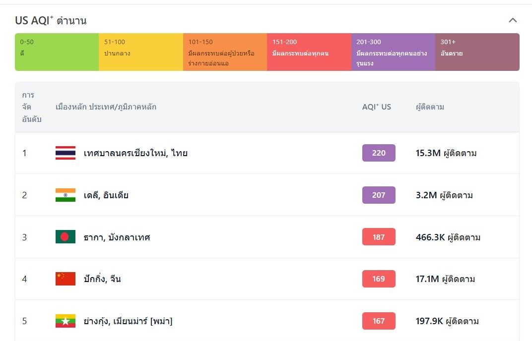 - อันดับ 1 เทศบาลนครเชียงใหม่ ประเทศไทย ค่า AQI อยู่ที่ระดับ 220 (สีม่วง)