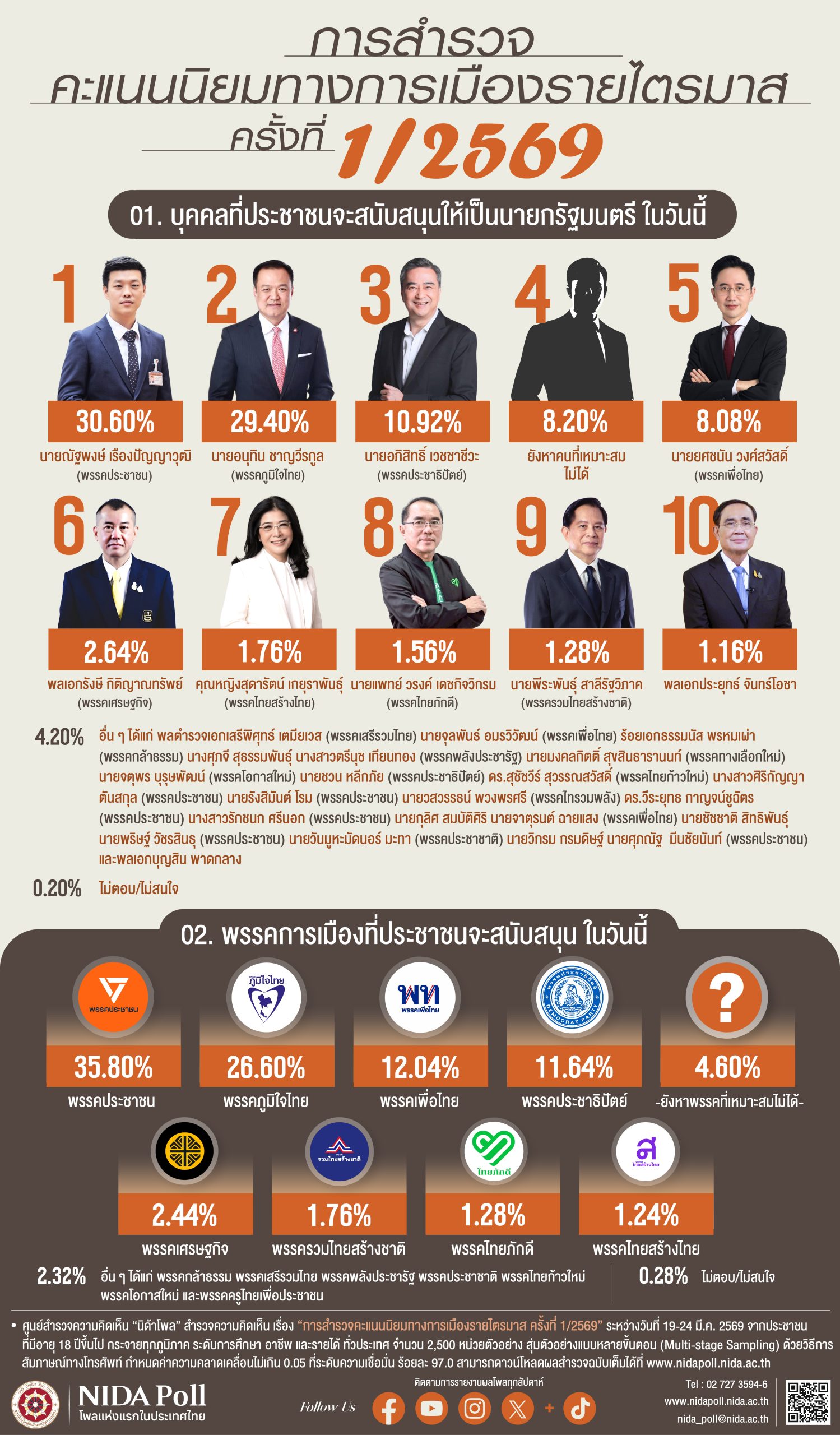 ศูนย์สำรวจความคิดเห็น “นิด้าโพล” สถาบันบัณฑิตพัฒนบริหารศาสตร์ (นิด้า) เปิดเผยผลการสำรวจ เรื่อง “การ สำรวจคะแนนนิยมทางการเมืองรายไตรมาส ครั้งที่ 1/2569”