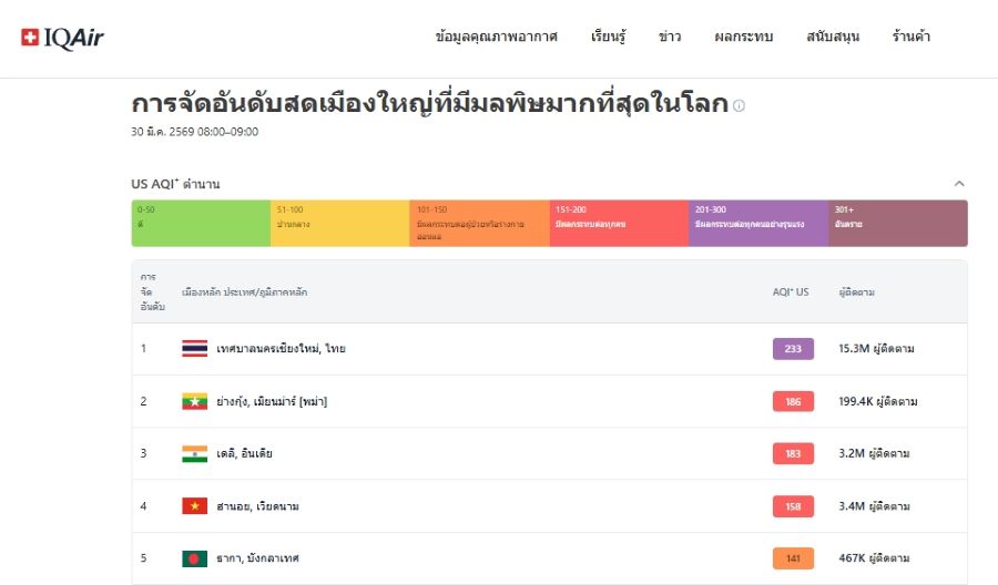 เชียงใหม่อ่วม! ขึ้นอันดับ 1 เมืองใหญ่มลพิษสูงสุดในโลก/PM2.5 เกินค่ามาตรฐาน 31 จ.