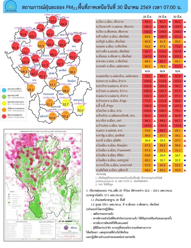 ขณะที่ศูนย์สื่อสารการแก้ไขปัญหามลพิษทางอากาศ รายงานการติดตามตรวจสอบคุณภาพอากาศ ประจำวันที่ 30 มี.ค.69 ณ เวลา 07.00 น. ดังนี้