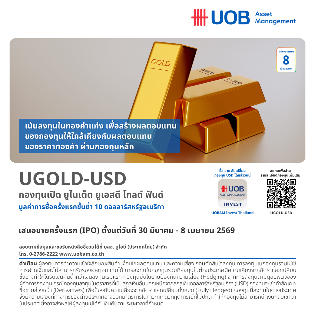 บลจ.ยูโอบี (ประเทศไทย) เสนอโอกาสการลงทุนในกองทุนเปิด ยูไนเต็ด ยูเอสดี โกลด์ ฟันด์ (UGOLD-USD) เพื่อรองรับนักลงทุนที่ต้องการกระจายการลงทุนในทองคำแท่งในสกุลเงินดอลลาร์สหรัฐ (USD)ผ่านกองทุนหลักที่มีโอกาสสร้างผลตอบแทนให้ใกล้เคียงกับผลตอบแทนของราคาทองคำภายหลังหักค่าธรรมเนียมและค่าใช้จ่ายทั้งหมดของกองทุน อีกทั้งยังเป็นเครื่องมือในการกระจายการลงทุนและการบริหารความเสี่ยงของพอร์ตลงทุน เสนอขายครั้งแรกระหว่างวันที่ 30 มีนาคม-8 เมษายน 2569