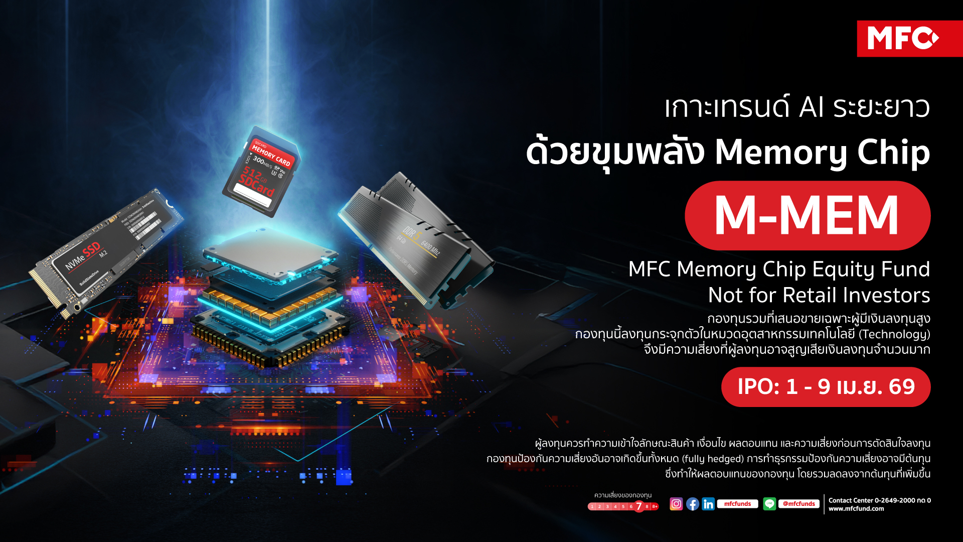 บลจ.เอ็มเอฟซี [MFC] เปิดตัวกองทุนเปิดเอ็มเอฟซี เมมโมรี่ ชิป อิควิตี้ ห้ามขายผู้ลงทุนรายย่อย (MFC Memory Chip Equity Fund Not for Retail Investors) หรือ”M-MEM” เกาะเทรนด์ AI ลงทุนหุ้น Memory Chip หนุนโครงสร้างพื้นฐานสำคัญของเศรษฐกิจดิจิทัลในอนาคต ดันเทรนด์ AI, Data Center ดีมานด์พุ่งสูง ส่งผลหุ้นกลุ่มอุตสาหกรรมชิปหน่วยความจำ เข้าสู่รอบการเติบโตก้าวกระโดดครั้งใหม่ พร้อมเปิดขาย IPO วันที่ 1 – 9 เมษายน 2569 นี้ ลงทุนขั้นต่ำครั้งแรก 500,000 บาท และครั้งถัดไป 1,000 บาท