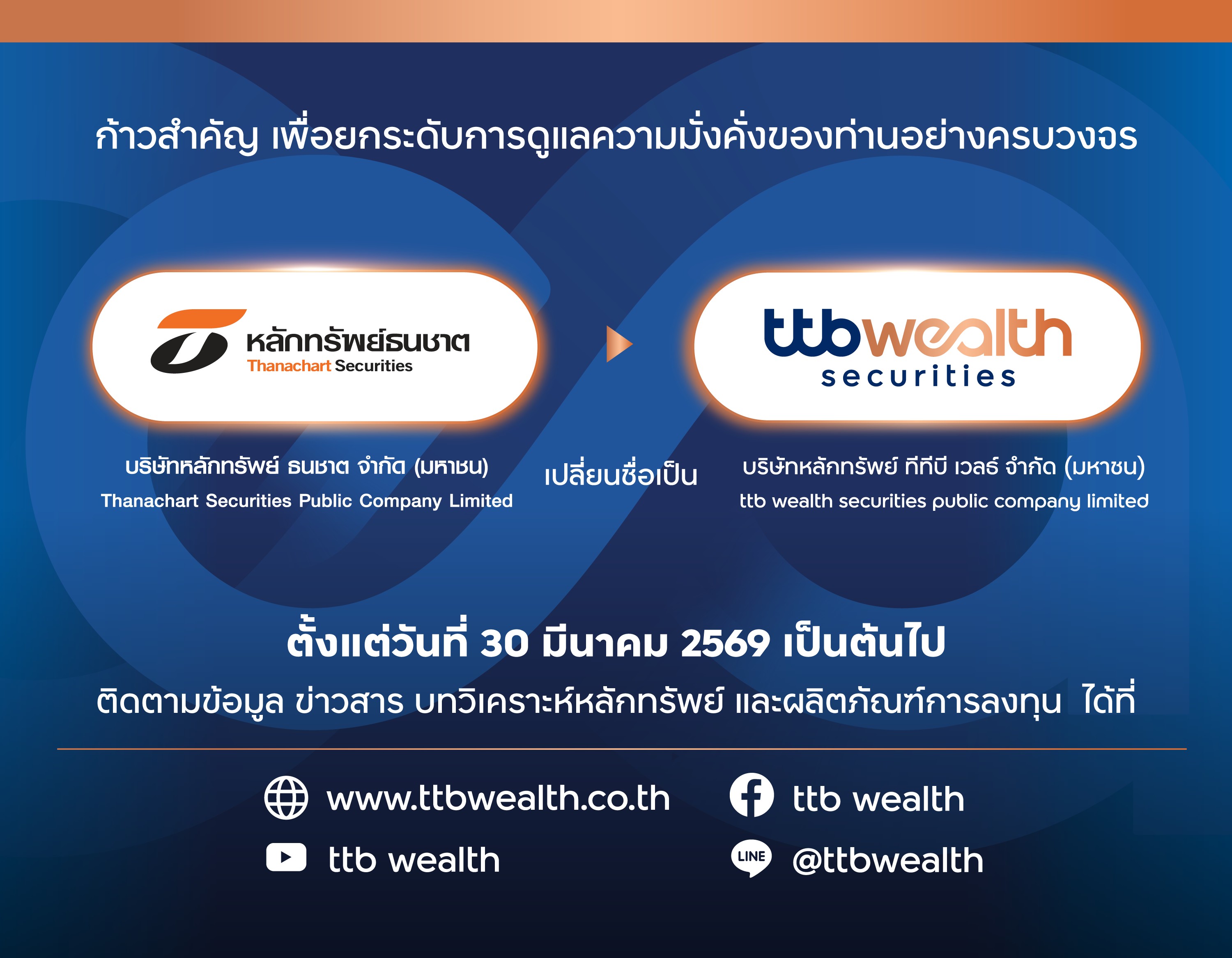 ทีทีบี ประกาศเปลี่ยนชื่อ บล.ธนชาต เป็น บล.ทีทีบี เวลธ์ (ttb wealth securities public company limited) พร้อมใช้ชื่อย่อ ttb wealth และชื่อย่อในระบบตลาดหลักทรัพย์ฯ TTBWEALTH เพื่อสะท้อนทิศทางการดำเนินธุรกิจด้านการลงทุนและการบริหารความมั่งคั่ง ภายใต้กลุ่มทีทีบีอย่างชัดเจน ทั้งนี้ ลูกค้าและผู้สนใจสามารถติดตามข้อมูล ข่าวสาร บทวิเคราะห์หลักทรัพย์ และผลิตภัณฑ์การลงทุน ได้ทุกช่องทางการสื่อสารของบริษัทในชื่อ ttb wealth ตั้งแต่วันที่ 30 มีนาคม 2569 เป็นต้นไป