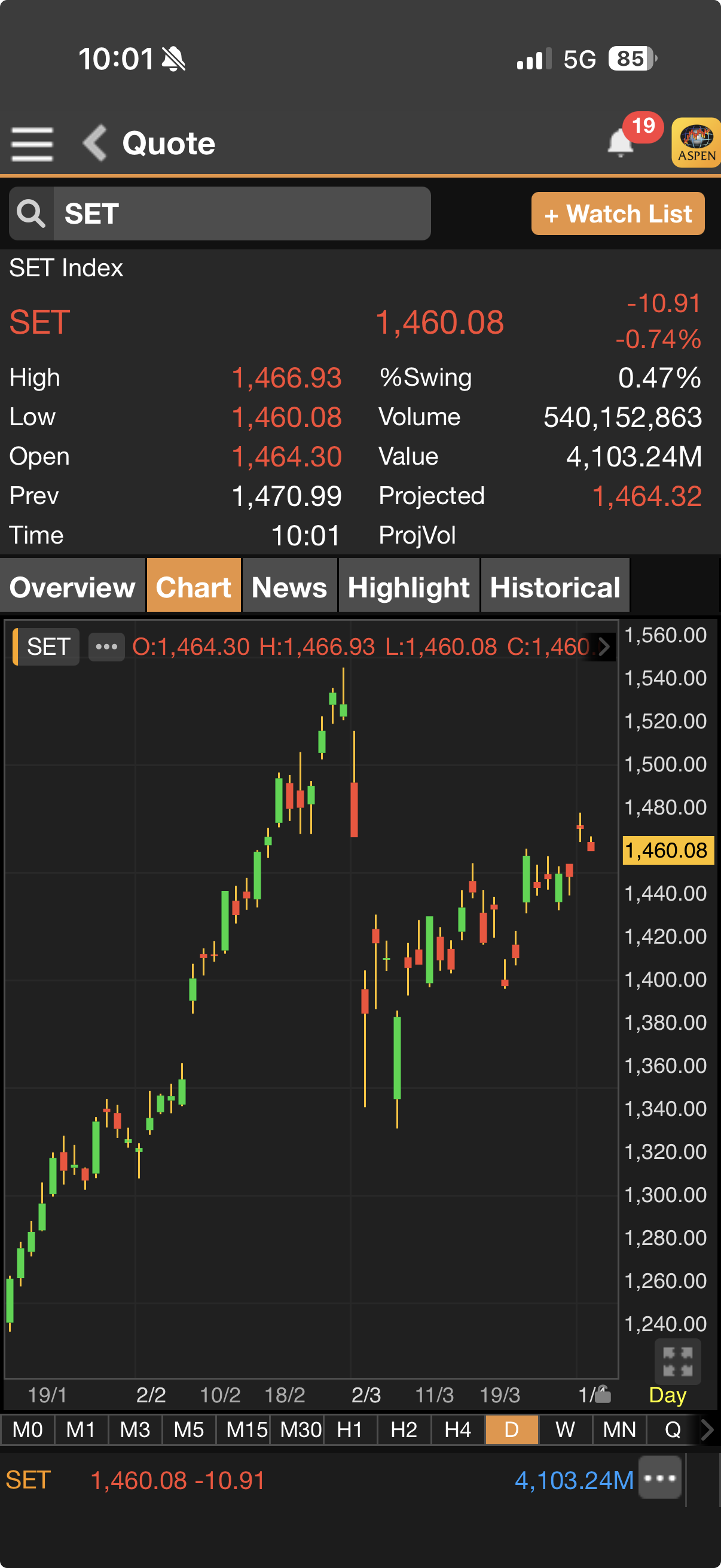 เมื่อเวลา 10.01 น.ดัชนี SET มาอยู่ที่ 1,460.08 จุด ลดลง 10.91 จุด (-0.74%)