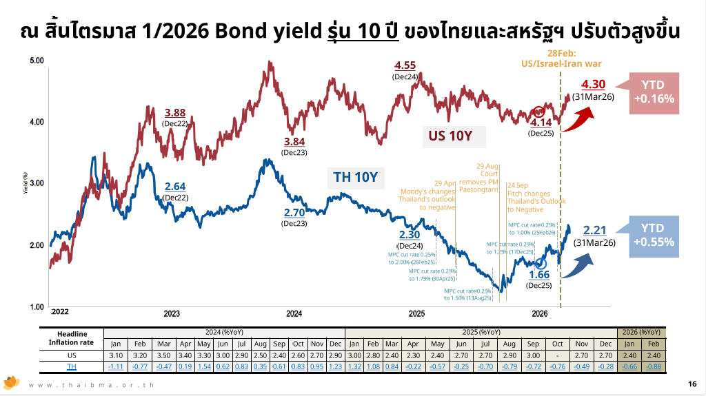 ขณะที่ Bond yield ของไทยขยับสูงขึ้นทุกรุ่นอายุในลักษณะ Bear Steepening โดย Bond yield ระยะยาวสูงขึ้นมากกว่าระยะสั้น สืบเนื่องจากความกังวลอัตราเงินเฟ้อจากสถานการณ์ในตะวันออกกลาง โดย Bond yield รุ่นอายุ 2 ปี 5 ปี และ10 ปี เพิ่มขึ้น 25, 42 และ 55 bps. จากสิ้นปี 68 มาอยู่ที่ 1.38%, 1.70% และ 2.21% ตามลำดับ ณ สิ้นไตรมาส 1/69 ขณะที่เงินเฟ้อไทย ติดลบ 0.88% จะมี Real Return ราว 2%
