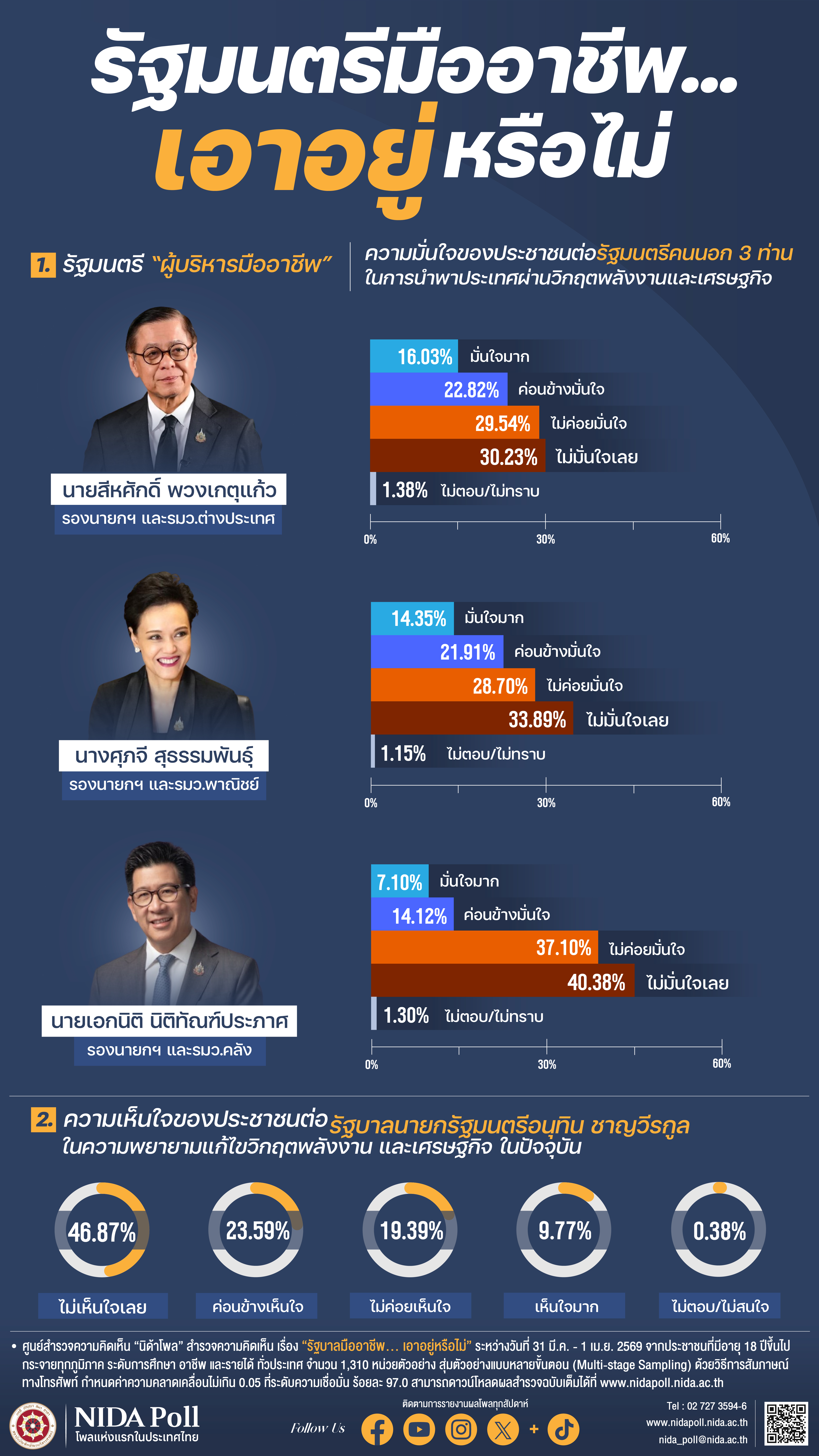 ศูนย์สำรวจความคิดเห็น “นิด้าโพล” สถาบันบัณฑิตพัฒนบริหารศาสตร์ (นิด้า) เปิดเผยผลการสำรวจเรื่อง “รัฐมนตรีมืออาชีพ… เอาอยู่หรือไม่” เกี่ยวกับความคิดเห็นของประชาชนต่อความพยายามของรัฐบาลนายอนุทิน ชาญวีรกูล นายกรัฐมนตรีและรมว.มหาดไทย ในการแก้ไขวิกฤตพลังงานและเศรษฐกิจ โดยทำการสำรวจระหว่างวันที่ 31 มีนาคม -1 เมษายน 2569 จากประชาชนที่มีอายุ 18 ปีขึ้นไป กระจายทุกภูมิภาค ระดับการศึกษา อาชีพ และรายได้ ทั่วประเทศ รวมจำนวนทั้งสิ้น 1,310 หน่วยตัวอย่าง