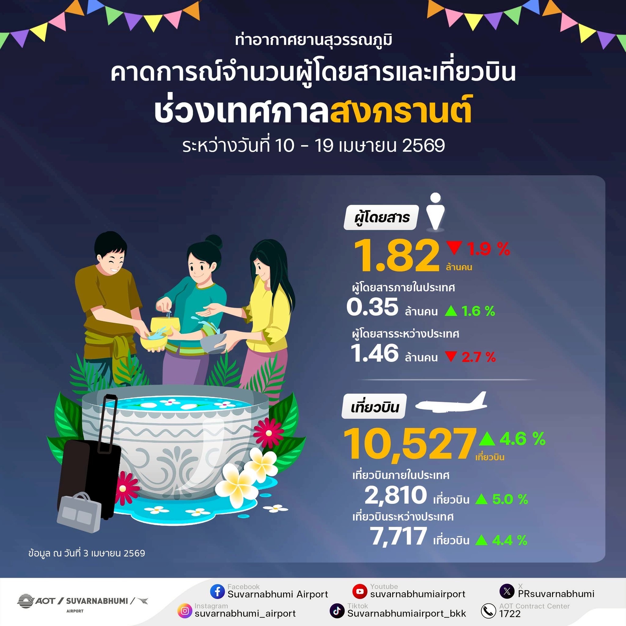 นายกิตติพงศ์ กิตติขจร ผู้อำนวยการ ท่าอากาศยานสุวรรณภูมิ (ทสภ.) บมจ.ท่าอากาศยานไทย [AOT] เปิดเผยว่า ในช่วงเทศกาลสงกรานต์ประจำปี 69 นี้ คาดการณ์จำนวนผู้โดยสารในภาพรวมที่เดินทางผ่าน ทสภ.ระหว่างวันที่ 10-19 เม.ย.69 (รวม 10 วัน) ประมาณ 1,820,000 คน หรือเฉลี่ยวันละประมาณ 182,000 คน ลดลงจากช่วงเดียวกันในปีก่อน 1.9%