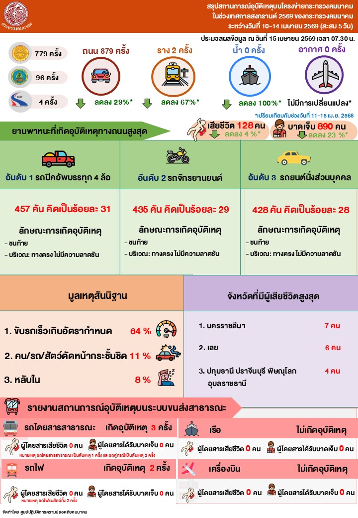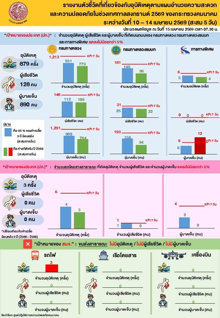 ศูนย์ปฏิบัติการความปลอดภัยคมนาคม กระทรวงคมนาคม (ศปภ.คค.) สรุปข้อมูลการเดินทางบนโครงข่ายคมนาคมในช่วงเทศกาลสงกรานต์ 2569 ระหว่างวันที่ 10 – 14 เมษายน 2569 สะสม 5 วัน (ข้อมูล ณ วันที่ 15 เมษายน 2569 เวลา 08.00 น.) พบว่า ระบบขนส่งสาธารณะสามารถรองรับการเดินทางของประชาชนได้อย่างเพียงพอ โดยมีการเดินทางด้วยระบบขนส่งสาธารณะรวม 12,640,505 คน เพิ่มขึ้น 2.37% เมื่อเปรียบเทียบกับช่วงเวลาเดียวกันของปีที่ผ่านมา (11 – 15 เมษายน 2568) ทั้งนี้ ระบบรางมีสัดส่วนการใช้บริการสูงสุด คิดเป็น 46% ขณะที่ผู้ใช้บริการสูงสุดในแต่ละภูมิภาค ได้แก่ ภาคกลาง (ทางอากาศขาออก) 248,159 คน ภาคใต้ (ทางราง) 124,769 คน ภาคตะวันออกเฉียงเหนือ (ทางถนน) 169,296 คน ภาคเหนือ (ทางถนน) 104,036 คน และภาคตะวันออก (ทางถนน) 96,369 คน ส่วนการเดินทางด้วยระบบขนส่งสาธารณะระหว่างประเทศรวม 1,177,027 คน สำหรับการจราจรเข้า – ออกกรุงเทพฯ บนทางหลวงสายหลัก 12 เส้นทาง มีปริมาณ 4,751,489คัน ลดลง 3.23% และการเดินทางภายในกรุงเทพฯ บนทางพิเศษของการทางพิเศษแห่งประเทศไทย (กทพ.) มีปริมาณ 6,240,564 คัน ลดลง 4.66%