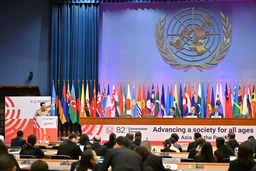 นายอนุทิน ชาญวีรกูล นายกรัฐมนตรี และรมว.มหาดไทย กล่าวปาฐกถาพิเศษ ในพิธีเปิดการประชุมประจำปี สมัยที่ 82 (82nd Session of the Commission: CS82) ของคณะกรรมาธิการเศรษฐกิจและสังคมแห่งสหประชาชาติสำหรับเอเชียและแปซิฟิก (ESCAP) ภายใต้หัวข้อหลัก “Leaving no one behind: advancing a society for all ages in Asia and the Pacific” ณ ศูนย์ประชุมสหประชาชาติ (UN) กรุงเทพฯ