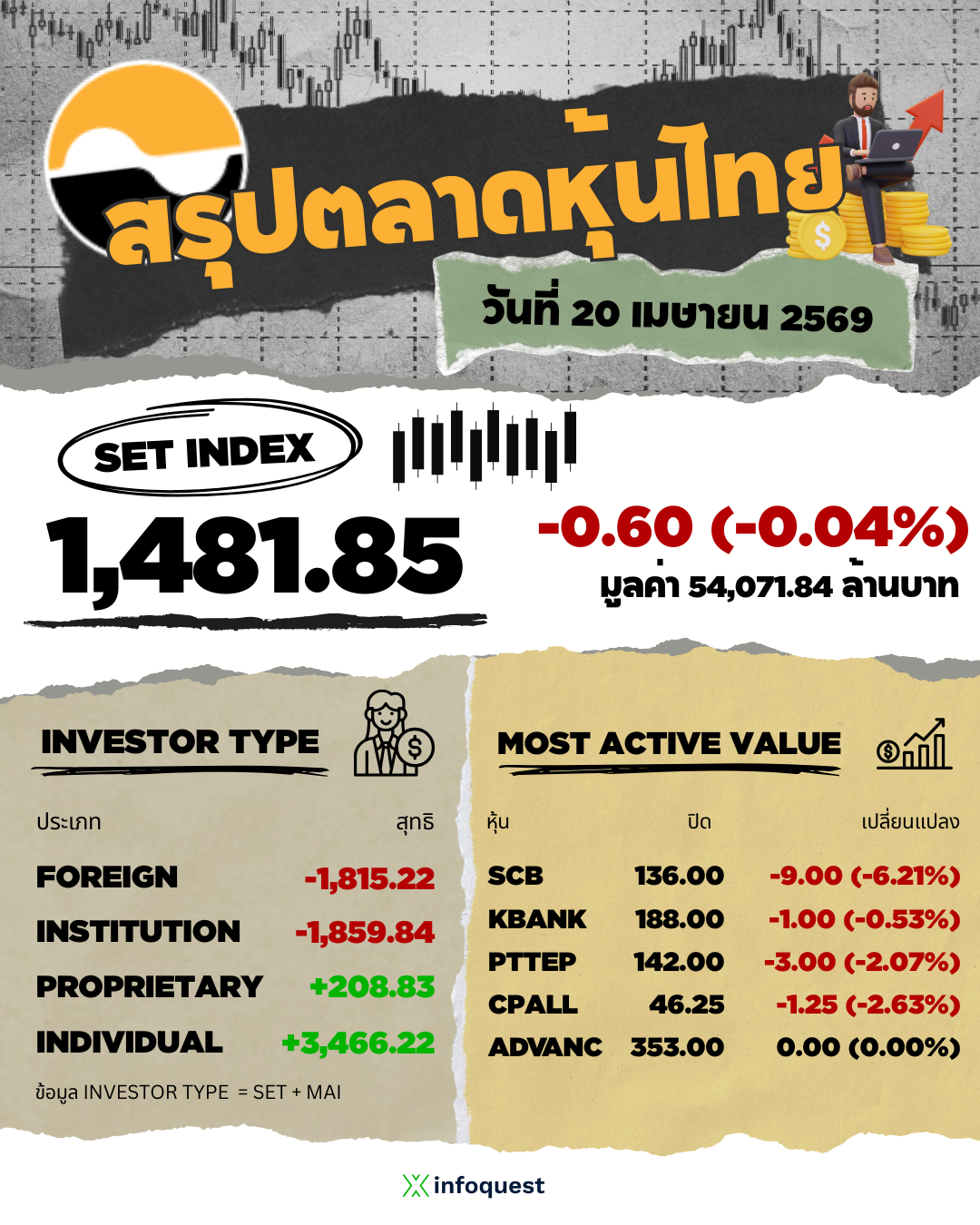 - ตลาดหุ้นไทยปิดวันนี้ที่ระดับ 1,481.85 จุด ลดลง 0.60 จุด (-0.04%) มูลค่าซื้อขาย 54,071.84 ล้านบาท