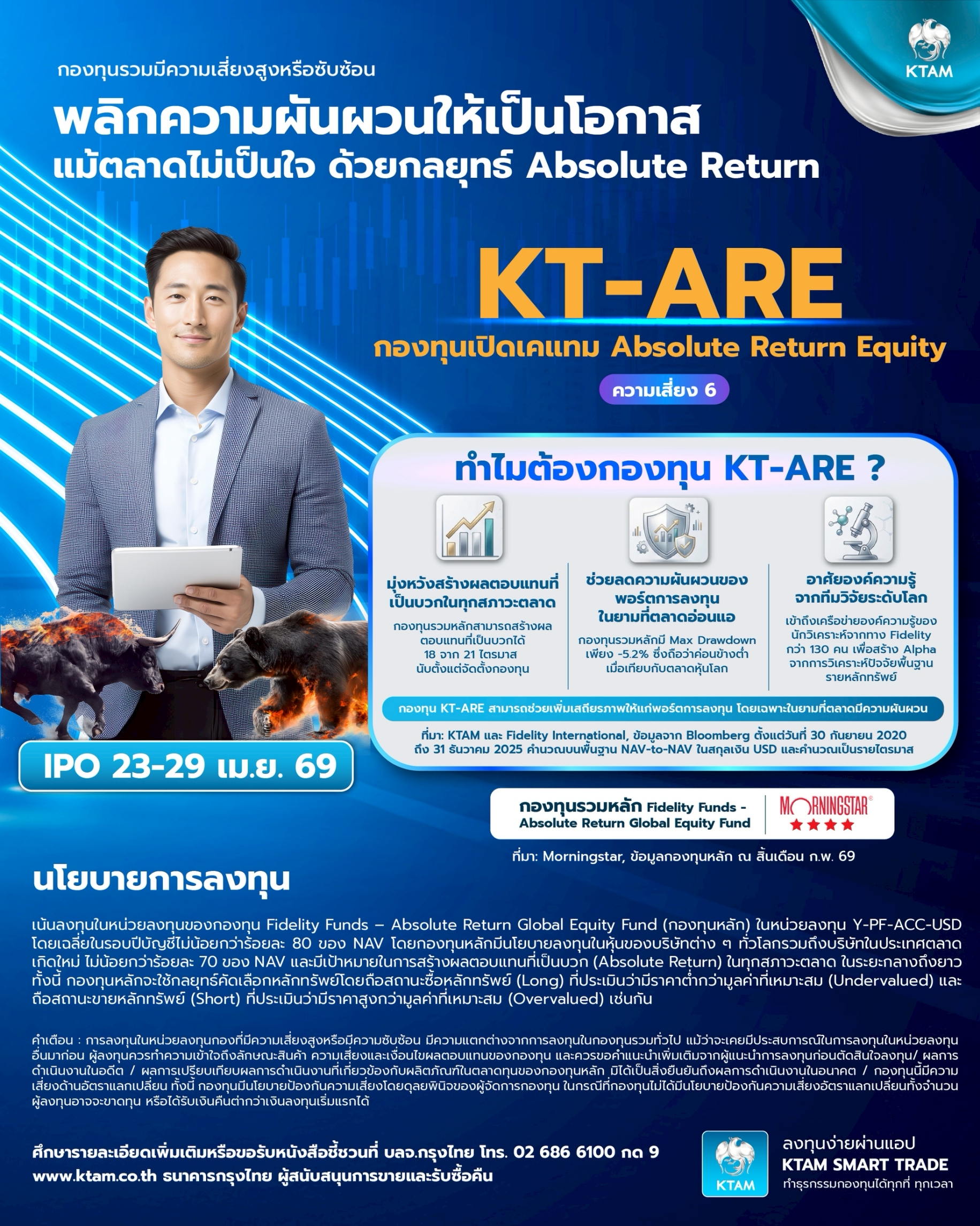 บริษัทฯ จึงได้เปิดเสนอขาย กองทุนเปิดเคแทม Absolute Return Equity (KT-ARE) (ความเสี่ยงระดับ 6) ซึ่งเป็นกองทุนที่มุ่งเน้นการสร้างผลตอบแทนที่เป็นบวก (Absolute Return) ไม่ว่าสภาวะตลาดจะขึ้นหรือลงก็ตาม โดยกำหนดเปิดเสนอขายครั้งแรกระหว่างวันที่ 23 – 29 เม.ย. 69 นี้