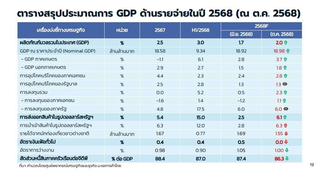 ศูนย์พยากรณ์เศรษฐกิจและธุรกิจ มหาวิทยาลัยหอการค้าไทย ปรับประมาณการ GDP ปี 68 เพิ่มเป็น 2.0% จากเดิมที่คาดว่าจะขยายตัว 1.7% หลังปรับเพิ่มเป้าส่งออกเป็น 6.1% การลงทุนภาคเอกชน ปรับเพิ่มเป็น 1.1% จากเดิมคาดหดตัว-1.2% และการอุปโภคบริโภคภาคเอกชนปรับเพิ่มเป็น 2.8% จากผลของมาตรการกระตุ้นเศรษฐกิจและการบริโภคในช่วงปลายปี