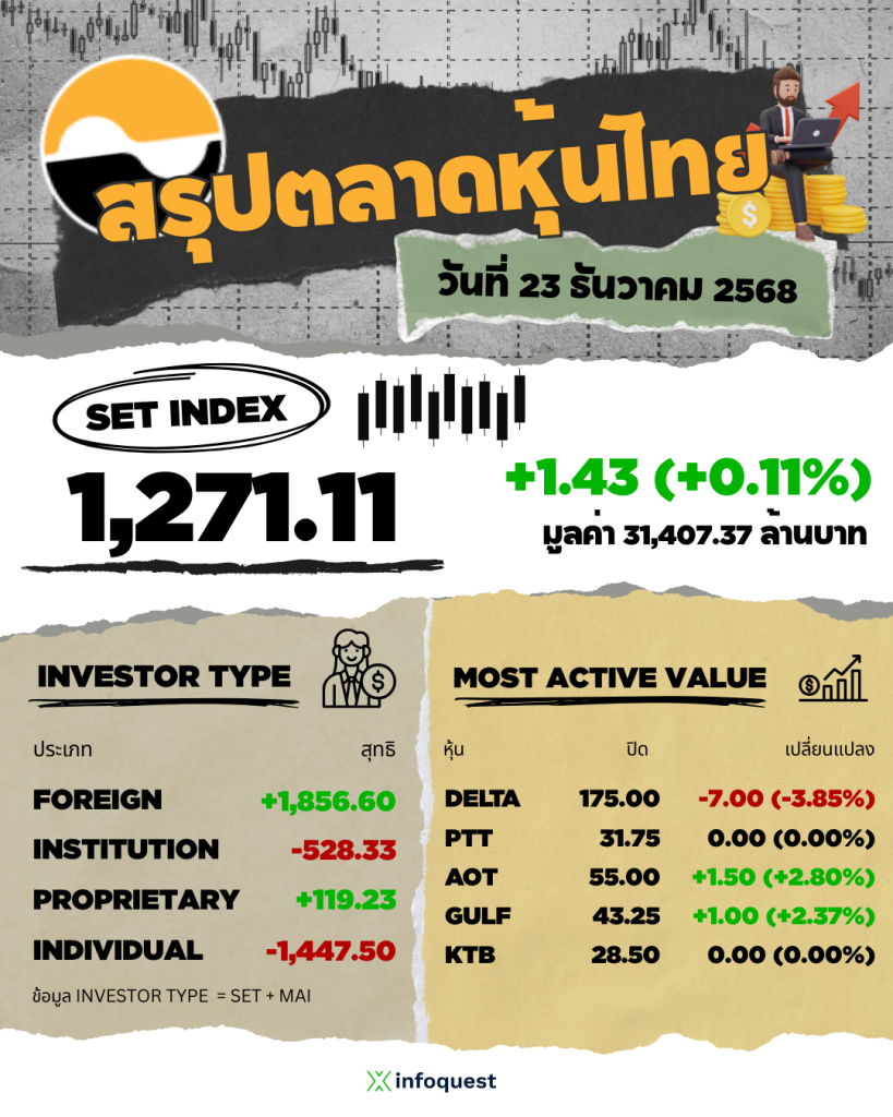 - ตลาดหุ้นไทยปิดวันนี้ที่ 1,271.11 จุด เพิ่มขึ้น 1.43 จุด (+0.11%) มูลค่าซื้อขาย 31,407.37 ล้านบาท