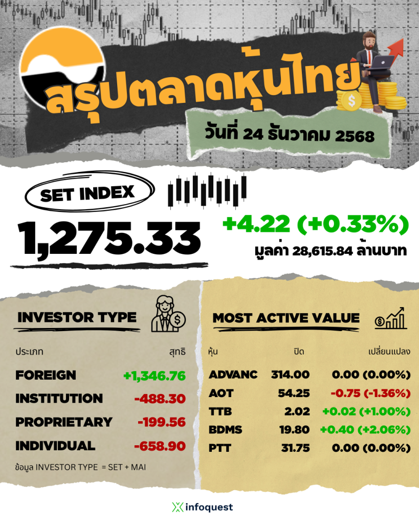 - ตลาดหุ้นไทยปิดวันนี้ที่ 1,275.33 จุด เพิ่มขึ้น 4.22 จุด (+0.33%) มูลค่าซื้อขาย 28,615.84 ล้านบาท