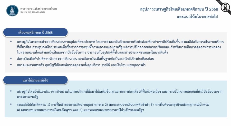 ธนาคารแห่งประเทศไทย (ธปท.) เผยเศรษฐกิจไทยเดือนพ.ย.68 ขยายตัวจากเดือนก่อนตามอุปสงค์ต่างประเทศ โดยการส่งออกสินค้าและรายรับนักท่องเที่ยวต่างชาติปรับเพิ่มขึ้น ส่งผลดีต่อกิจกรรมในภาคบริการที่เกี่ยวข้อง ส่วนอุปสงค์ในประเทศเพิ่มขึ้น จากการลงทุนทั้งภาคเอกชนและภาครัฐ แต่การบริโภคภาคเอกชนปรับลดลง