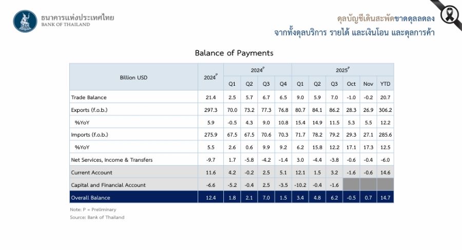 ด้านภาวะตลาดแรงงาน การจ้างงานในตลาดแรงงานโดยรวมทรงตัว โดยยังต้องติดตามจำนวนผู้ประกันตนตามมาตรา 33 ที่ลดลงต่อเนื่องในกลุ่มธุรกิจที่ได้รับผลกระทบจากการแข่งขันของสินค้านำเข้า สำหรับสัดส่วนผู้ขอรับสิทธิว่างงานต่อผู้ประกันตนลดลงทั้งในภาพรวมและรายใหม่ ทั้งนี้ ดุลบัญชีเดินสะพัดขาดดุล จากทั้งดุลบริการ รายได้ และเงินโอน และดุลการค้า